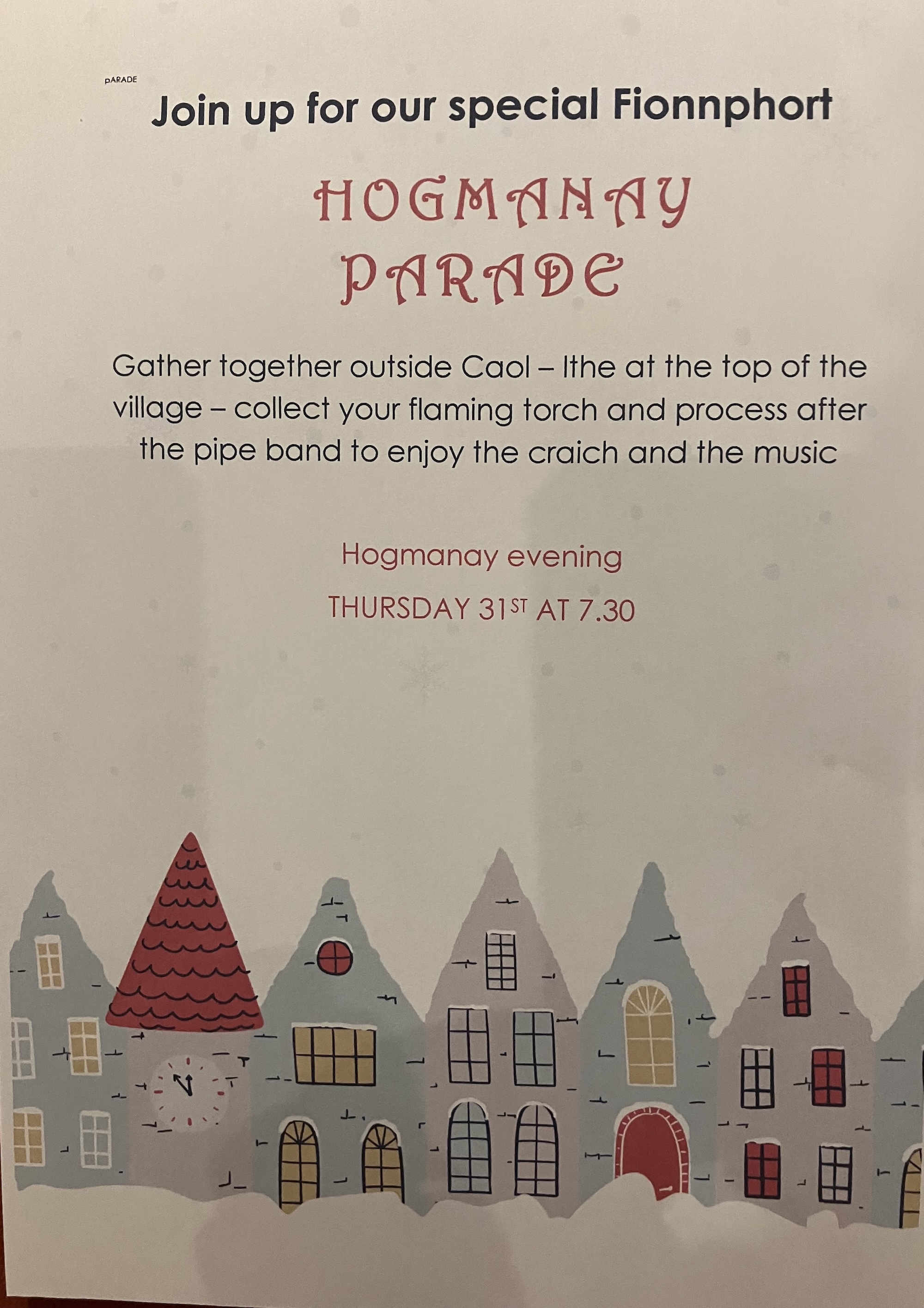 Celebrate with us and join the Torchlight procession through the village at 7.30 pm. Gather outside Caol-Ithe at the top of the village, collect your flaming torch and process...